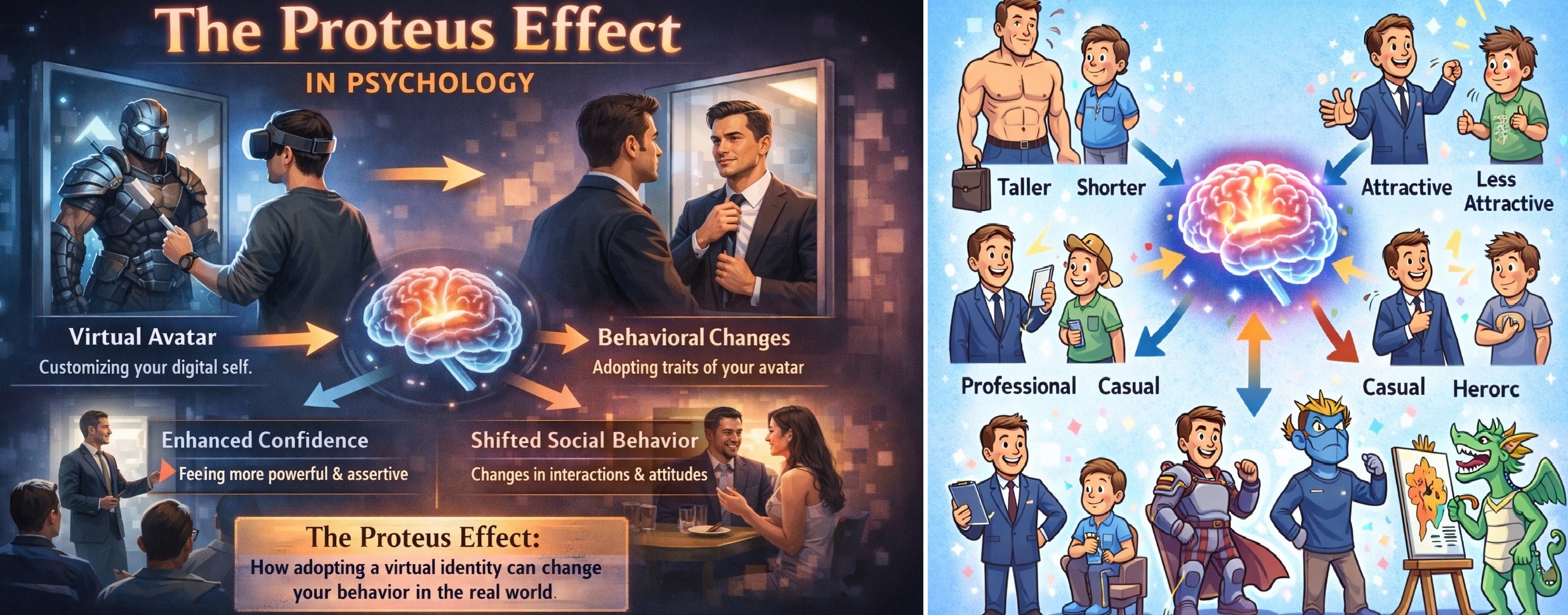 A pair of ChatGPT-based attempts to capture the Proteus effect visually…and notice the guy in the upper right has six fingers!