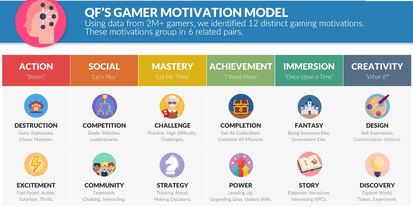The company’s model of twelve motivations is a window into the hearts and minds of “the gamer” and helps explain and predict their behaviors