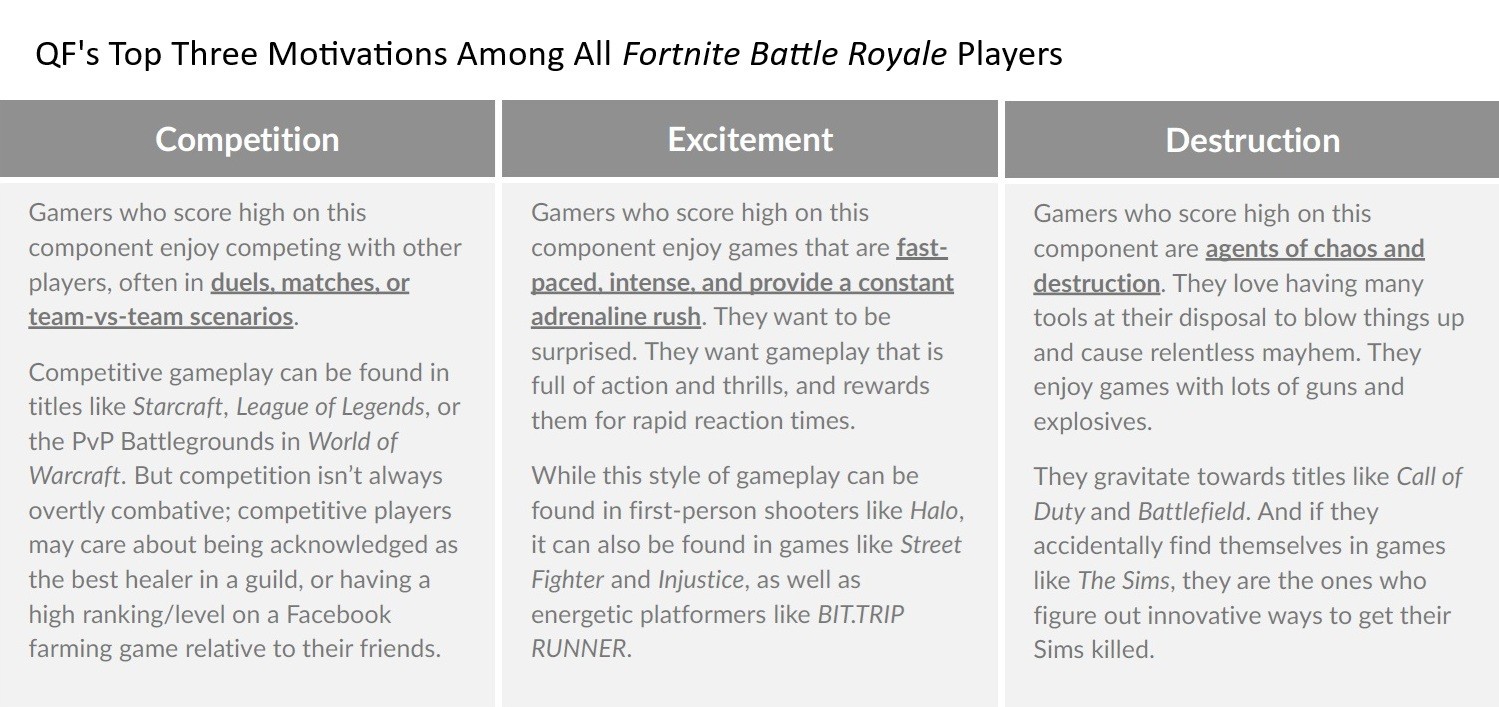 Fortnite players’ top three motivations to play, according to Quantic Foundry’s GMM.