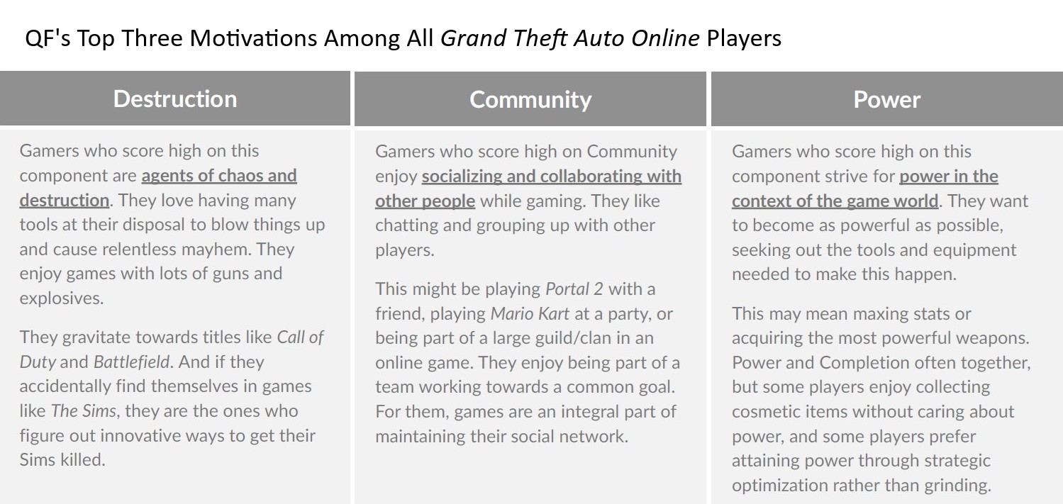 “When we looked at our data for GTA Online,” Yee said, “the motivations that were most distinct from average were: higher on destruction, higher on community, high on power.”