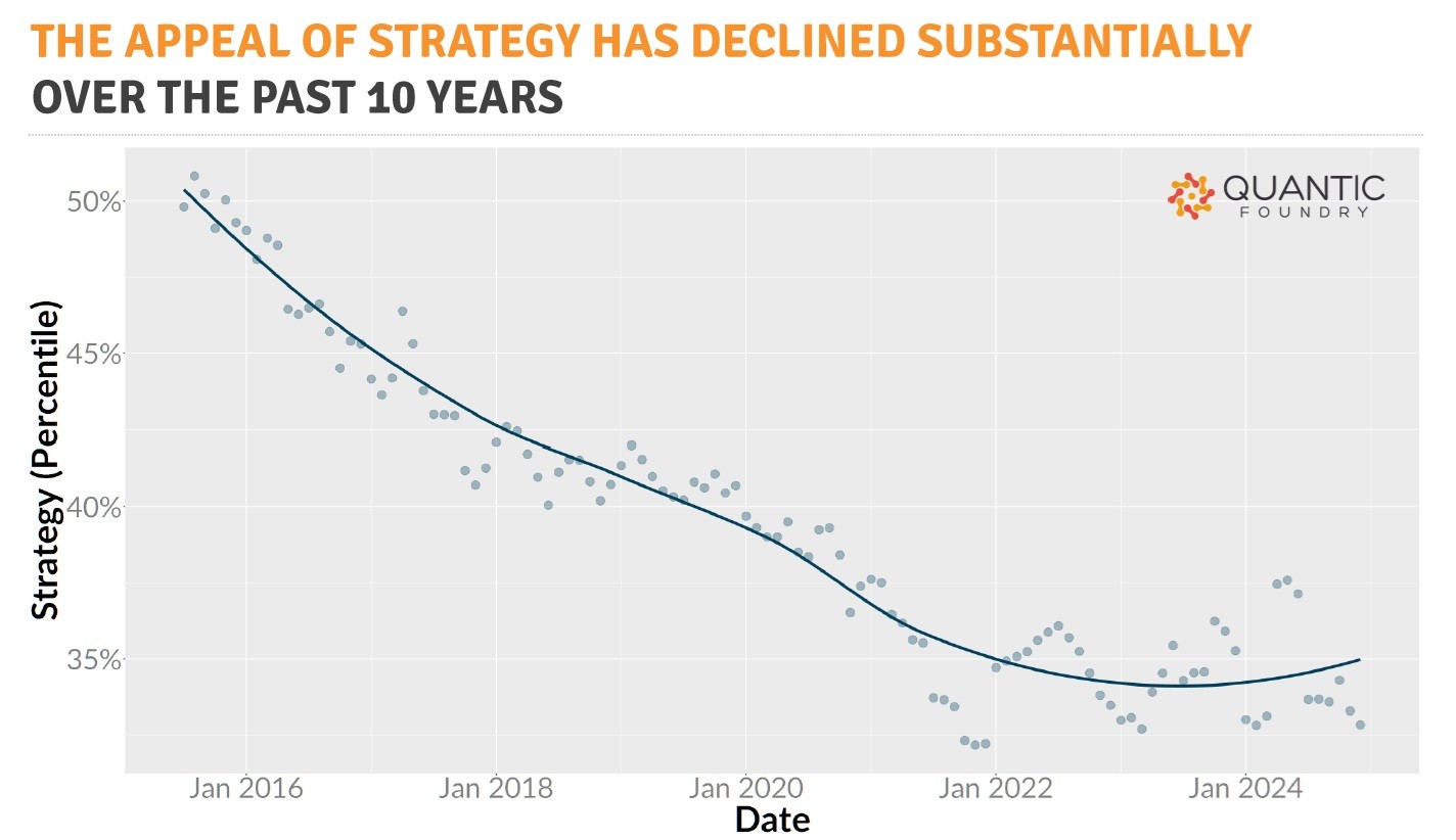 A slide from Nick Yee’s excellent GDC 2025 talk, Unlocking Gamer Motivations: Insights from 1.75+ Million Players Over a Decade, courtesy of Informa. Among other topics, Yee described the drop in motivation to play games that revolve around strategic thinking/planning mechanics and features, and he outlined some potential causes of the drop (note: a subscription to GDC Vault is required to access the session replay link above).