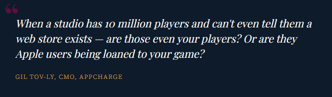 Second: the real unlocked asset isn't the margin — it's the player relationship. When everything ran through Apple and Google, studios didn't own their player data. They didn't have emails, payment credentials, or direct communication rights. "Those are Apple users being loaned to your game," as Gil put it. DTC forced studios to build direct relationships: email lists, Discord communities, WhatsApp groups, CRM infrastructure.