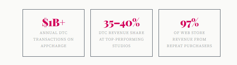 The fee differential is significant. Where Apple and Google charge up to 30%, Appcharge typically charges studios between 4% and 5% of transaction volume. For a studio routing 35–40% of revenue through DTC, that margin recovery funds additional user acquisition, headcount, and product investment.