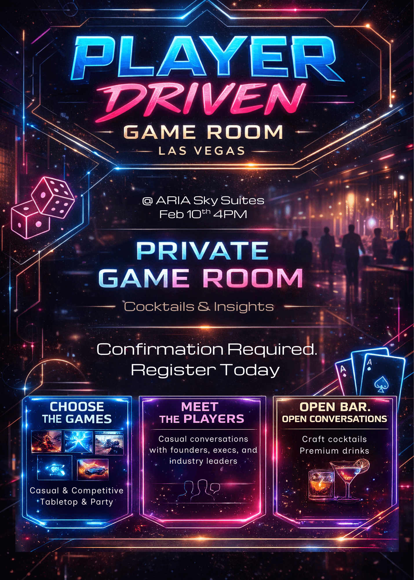 Join us for an incomparable evening at the Aria Sky Suites, the ultimate destination for discerning industry leaders during DICE 2026. This exclusive, private gathering offers a high-altitude escape from the summit floor, combining panoramic views of the Strip with a curated night of competitive play and high-level networking.